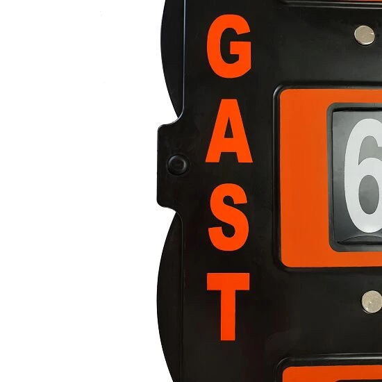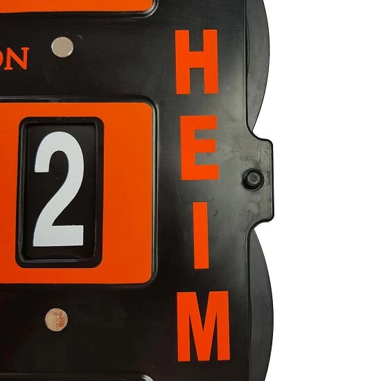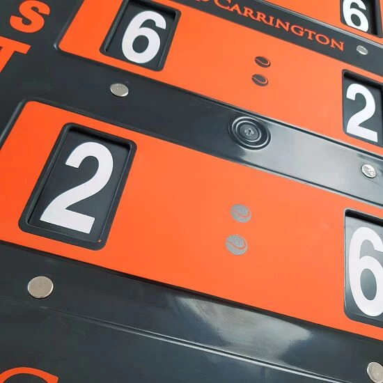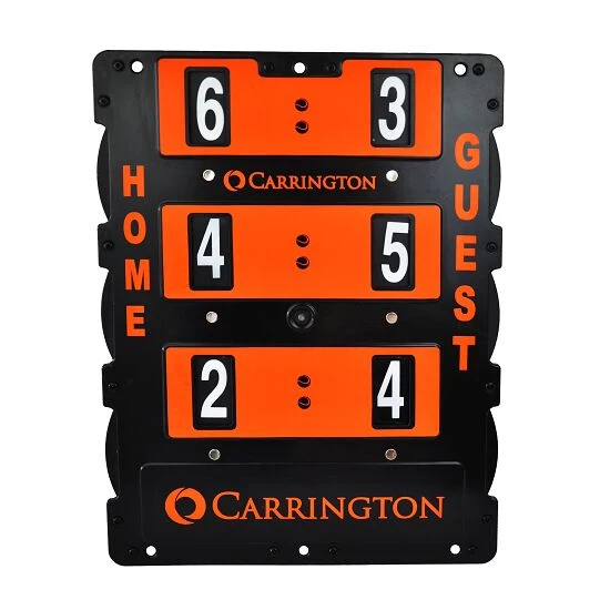 Die Carrington Tennis-Punkteanzeige ist eine manuelle Anzeigetafel, die dank ihres geringen Eigengewichtes zum mobilen Einsatz kommen kann. Durch die jeweils 3 Aussparungen am oberen und unteren Rand können Sie die Anzeige auch einhängen oder fest montieren. Drehen Sie die bis 7 bezifferten Einstellscheiben einfach und schnell an den seitlichen Rändern, um den Spielstand anzupassen. Die Spielstandtafel eignet sich zum Einsatz in Vereinen, Schulen sowie auf Tennisanlagen.