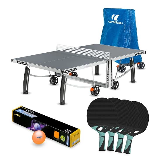 Mit dem Cornilleau Tischtennis-Set „PRO 540 Outdoor“ erleben Sie die besten Spieleigenschaften bei Sonnenschein oder Regen. Der erstklassige Spieltisch ist absolut wetterfest und mit einer 7 mm starken Melaminharzplatte ausgestattet. Zusätzlich verfügt der TT-Tisch über eine spezielle Mattop-Beschichtung, so dass die Oberfläche 10x weniger reflektiert. Dadurch wird das Spiel unter freiem Himmel zum ultimativen Vergnügen. Ob auf Rasen, Sand oder Kies: Mit seinen 4 Doppellenkrollen lässt sich der Tischtennistisch schnell und problemlos transportieren. Neben der strapazierfähigen Platte sind im Set außerdem eine praktische Abdeckhaube, Outdoor-Tischtennisschläger und -bälle enthalten.