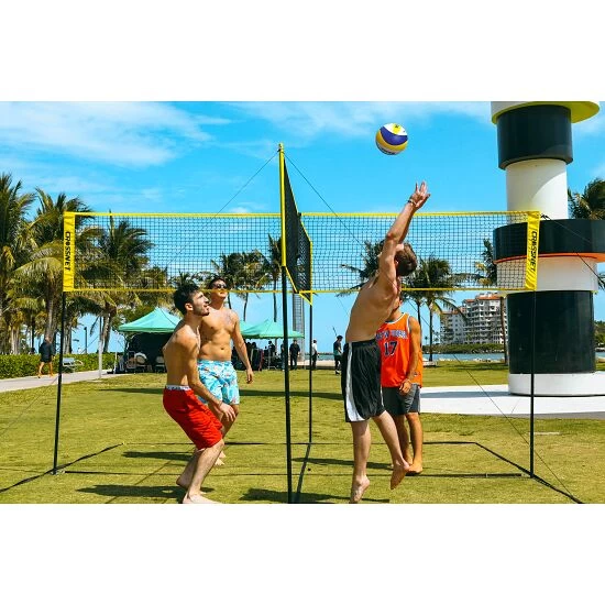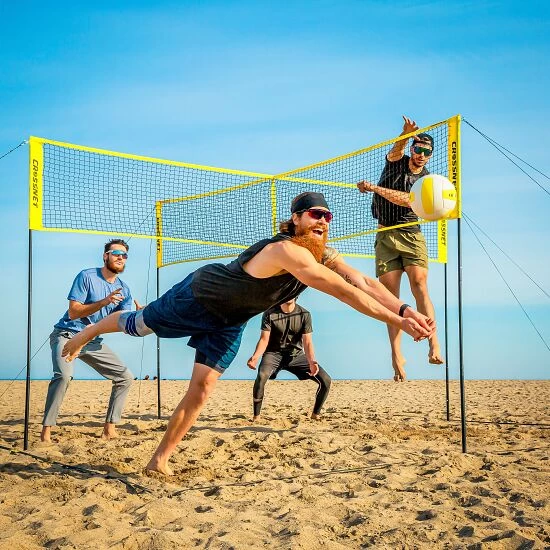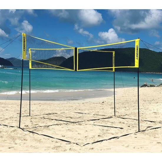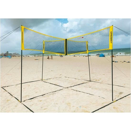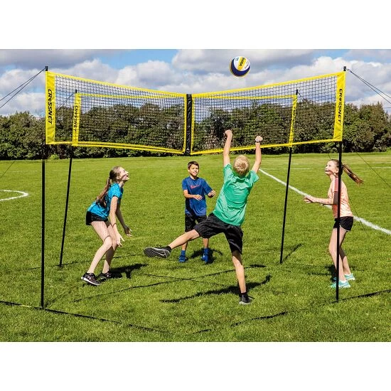 Das Volleyspiel von Crossnet stammt vom Pausenhofspiel „Four Square“ ab und spielt in 4 Feldern. Ziel ist es, die Gegenspieler „zu eliminieren“, indem der Ball in dem Feld eines Gegenspielers den Boden berührt. Gewonnen hat der Spieler, der zuerst 11 Punkte erzielt und gleichzeitig 2 Punkte Vorsprung hat. Das Set besteht aus einem Crossnet Volleyballnetz, einem Rucksack, 4 Stahlrohren, 4 Spannungsschnüren und 12 Bodenankern sowie einer äußeren Begrenzung und einer Mittelstange. Die Netzpfosten setzen sich jeweils aus 5 Einzelstangen zusammen, wodurch Sie in 4 verschiedenen Höhen spielen können. Der Auf- und Abbau ist dank mitgelieferter Montageanleitung leicht durchzuführen.
