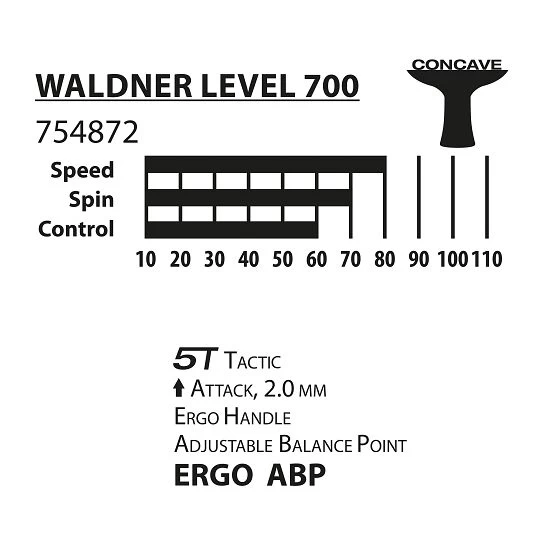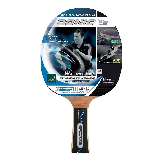 Der Donic Schildkröt Tischtennisschläger „Waldner 700“ ist ein Trainingsschläger für Freizeitspieler mit regelmäßiger Spielhäufigkeit und für den Schulsport. Der glatte Donic ***-Belag mit innen liegenden Noppen ermöglicht ein offensives Spiel mit allen Spieltechniken, einer guten Spinannahme und Geschwindigkeit. Der Ergo-Handle-Griff geht fließend in das Schlägerblatt über. Ohne scharfe Kanten und damit auch ohne unangenehme Druckstellen am Zeigefinger. Mit dem „Adjustable Balance Point“ (ABP) können Sie zudem den Schwerpunkt des Schlägers individualisieren. Einfach das Griffende aufdrehen, herausziehen und die Position des Zusatzgewichtes anpassen. Positionieren Sie es nahe am Schlägerblatt (kopflastig), führt dieses zu mehr Power bei den Schlägen. Nahe am unteren Griffende platziert bewirkt das Gewicht dagegen eine bessere Ballkontrolle und mehr Effet.