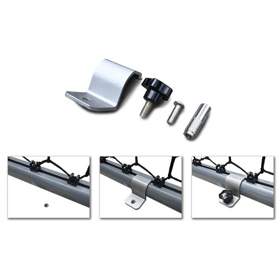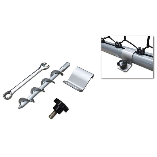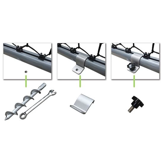 Bei dem Exit Befestigungs-Set für Exit Fußballtore „Scala“ wird auf jeder Seite des Torrahmens ein Bodenanker (Rasen) bzw. eine Hülse (harter Untergrund) in den Boden getrieben. Die Haltebügel werden am Rahmenprofil des Torrahmens befestigt und mit einer Befestigungsschraube am Bodenanker befestigt. Schon steht das Tor sicher. Die Bodenverankerung gibt es in 2 verschiedenen Ausführungen für Montage auf Naturrasen oder auf hartem Untergrund (z. B. Pflastersteine, Beton, Kunstrasen).