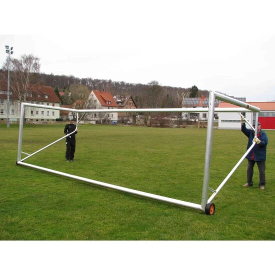Mit diesem Jugendfußballtor sind Sie in der Schule und im Verein perfekt ausgestattet. Es ist komplett vollverschweißt und bietet besonders hohe Stabilität. Die gesamte Torkonstruktion ist aus AluminiumAluminium ist ein korrosionsbeständiges und pflegeleichtes Leichtmetall, welches für den vielfältigen Einsatz im Innen- und Außenbereich geeignet ist. Aufgrund der hohen Elastizität und des nur geringen Gewichts, ist es eines der am häufigsten verwendeten Gebrauchsmaterialien. gefertigt und mit bodentiefen Netzbügeln ausgestattet. Am Bodenrahmen des Alu-Tors sind Vorrichungen angeschweißt zum Anbringen von Transportrollen, im Lieferumfang enthalten, so dass Sie das Jugendtor einfach nach hinten kippen und problemlos über den Sportplatz schieben können.