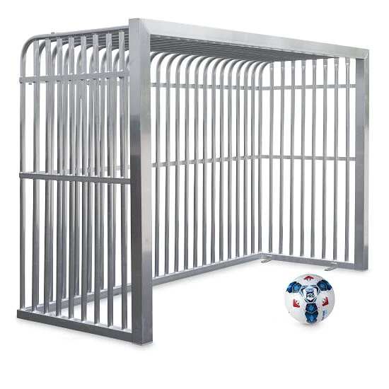 An Spielgeräte und Sportgeräte, die unbeaufsichtigt auf öffentlich zugänglichen Plätzen stehen werden ganz besonders hohe Ansprüche gestellt – Ansprüche an Materialqualität, Verarbeitung, Standfestigkeit, Langlebigkeit und natürlich allgemeine Produktsicherheit. All diese Qualitätsmerkmale erfüllt unser vollverschweißtes Bolzplatztor in zwei kompakten Größen. Die robuste Konstruktion aus AluminiumAluminium ist ein korrosionsbeständiges und pflegeleichtes Leichtmetall, welches für den vielfältigen Einsatz im Innen- und Außenbereich geeignet ist. Aufgrund der hohen Elastizität und des nur geringen Gewichts, ist es eines der am häufigsten verwendeten Gebrauchsmaterialien.-Rundrohr und -Quadratprofil ist in einem Stück verschweißt und damit praktisch unverwüstlich. Weder Taschenmesser noch Feuerzeuge können dem Mini-Bolzplatztor etwas anhaben – nur mit extremer Gewalt lassen sich Schäden verursachen. Das vermeidet ärgerliche Ausgaben für Ersatzteile und Reparaturen aufgrund von Vandalismus-Schäden. Ein Paar seitlich am Bodenrahmen angeschweißter Befestigungslaschen dient der Verankerung in einem Betonfundament und garantiert damit einen absolut sicheren Stand in jeder Situation. Mit seinen kompakten Abmessungen ist das Mini-Tor nicht nur für Fußball, sondern auch für Streethockey ideal geeignet.
