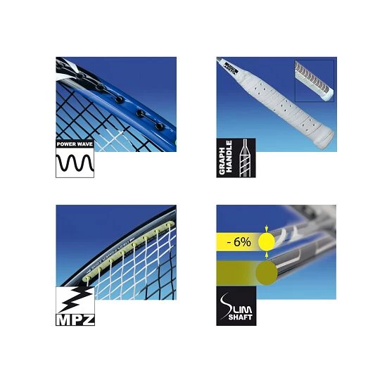 -Bereich stärker durchschwingen und mehr Rückschnellkraft entwickeln. Das Ergebnis ist mehr Power. - Power Waves: Bogengänge an den Rahmen Außenseiten minimieren den Reibungswiderstand der Saiten an den Umlenkpunkten und sorgen so für eine geringere Wechselbelastung. Das dabei entstehende elastischere Saitenbett sorgt für mehr Energietransfer durch erhöhten Trampolineffekt und maximiert die Ballbeschleunigung um ca. 5 %.
